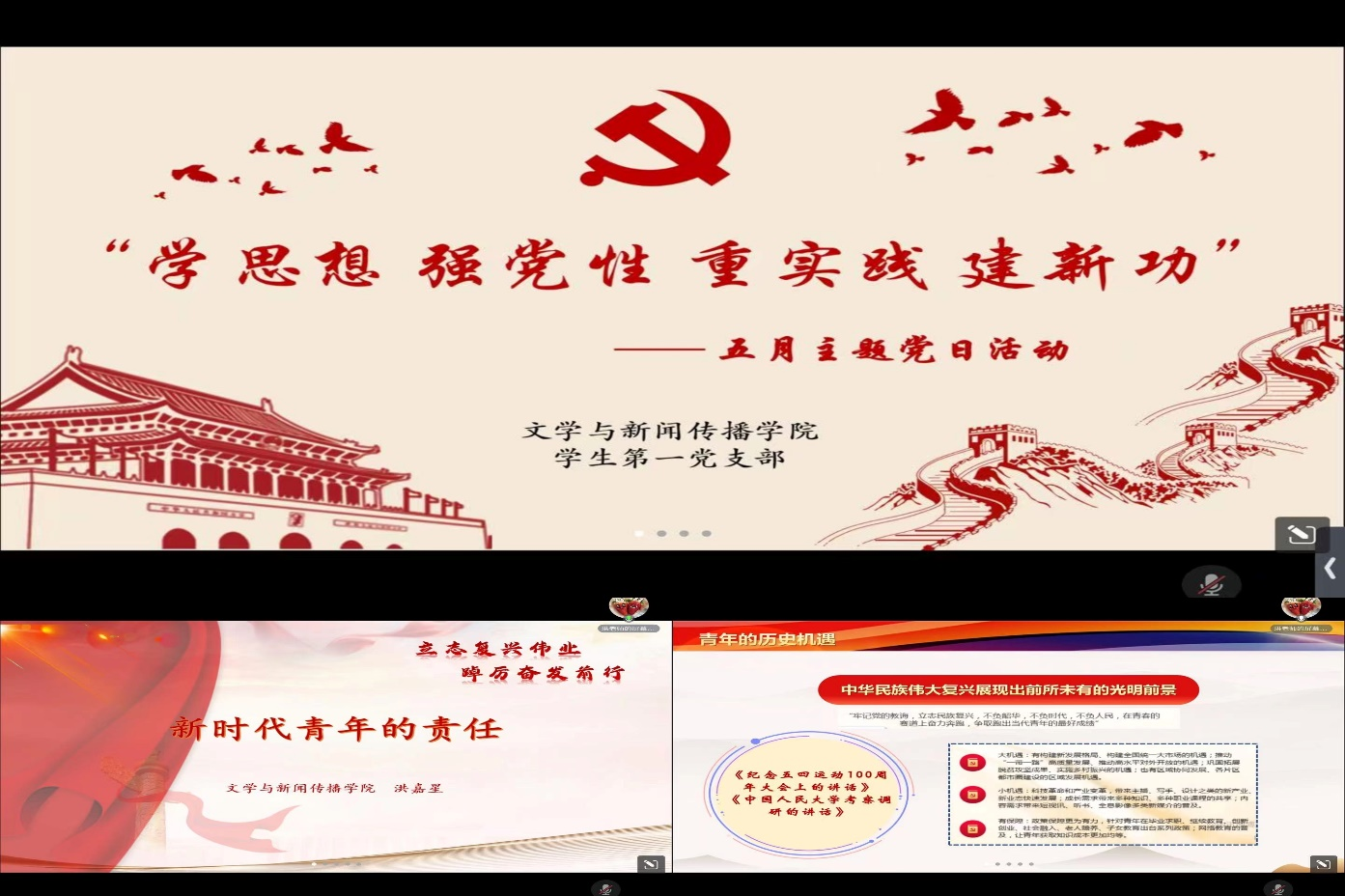 5月31日下午,9428cn太阳集团学生第一党支部在线上开展 “学思想强党性重实践建新功”主题党日活动。学院学生第一党支部全体党员、预备党员、发展对象参加了本次会议。会议由学院学生第一党支部书记洪嘉星主持。
