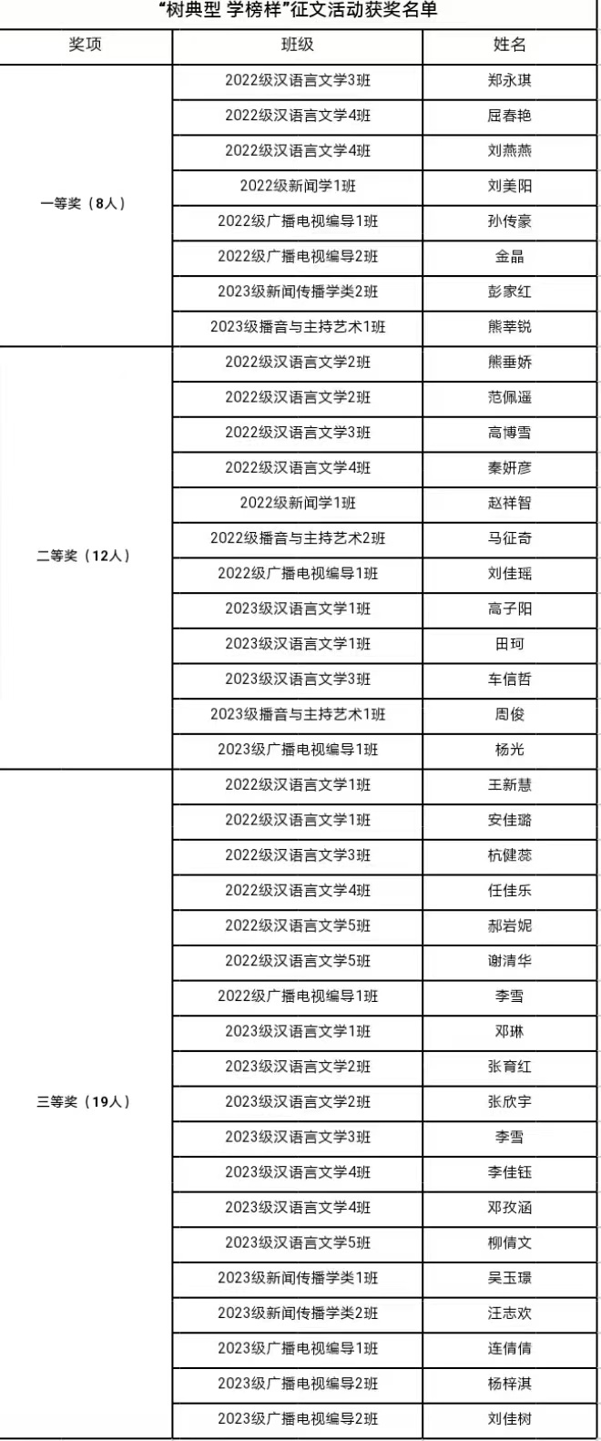 国家资助政策是社会公平的守护者。它不分贫富、地域或身份,给予有梦想、有潜力的学子平等的机会,让他们能够追逐自己的学业梦想。这一政策不仅是物质上的支持,更是精神上的鼓舞,让学子们感受到国家的关怀和期待,激发起他们奋斗的激情和责任感。截止4月8日,我院共收到百余份作品,经评审,2022级汉语言文学3班郑永琪等8名同学荣获一等奖,2022级新闻学1班赵祥智等12名同学荣获二等奖,2023级广播电视编导2班刘佳树等19名同学荣获三等奖。