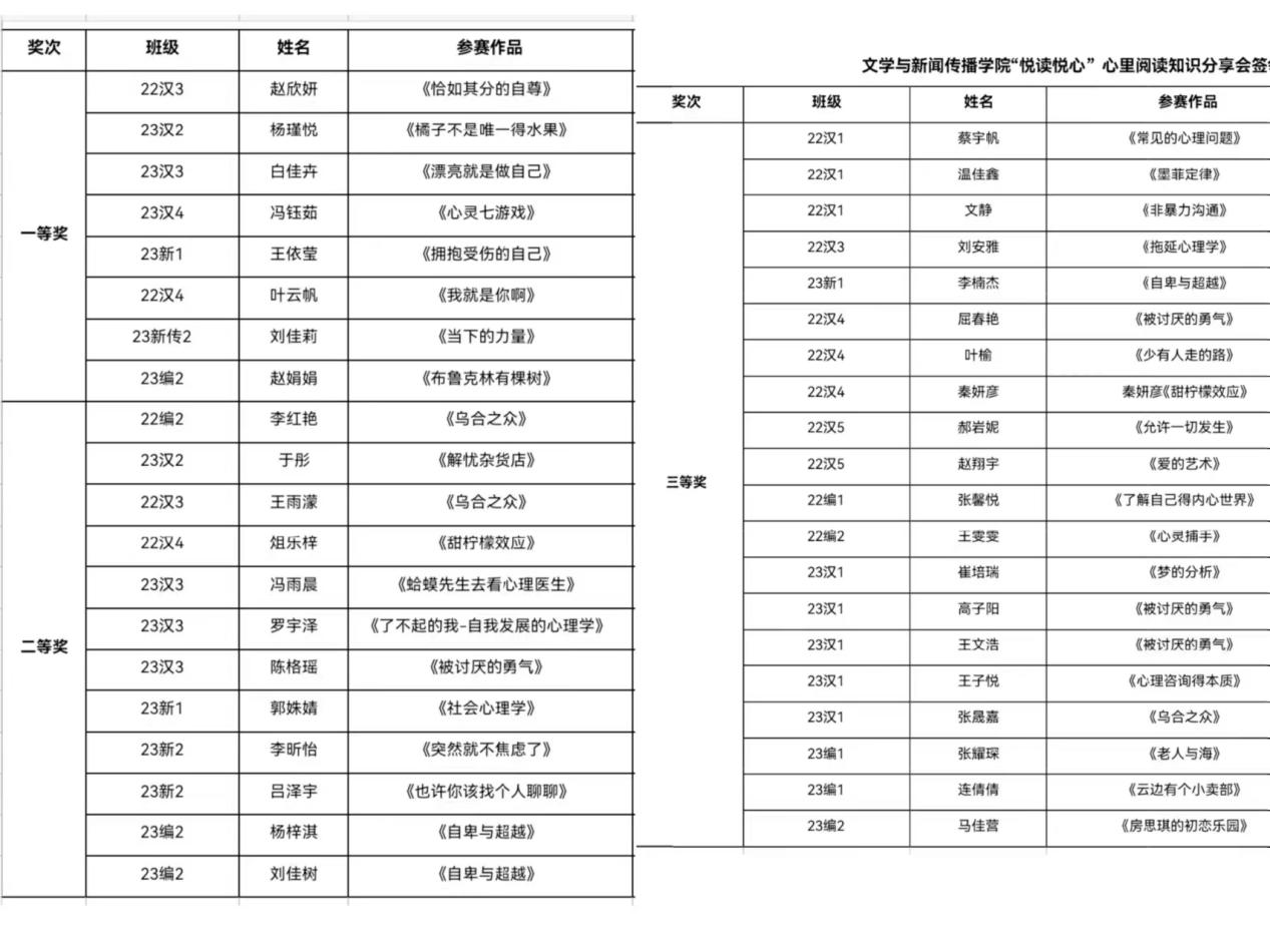 经评选,我院2023级汉语言三班赵欣妍等8名同学荣获一等奖,2022级广播电视编导二班李红艳等12名同学荣获二等奖,2022级汉语言文学一班蔡宇帆等20名同学荣获三等奖。