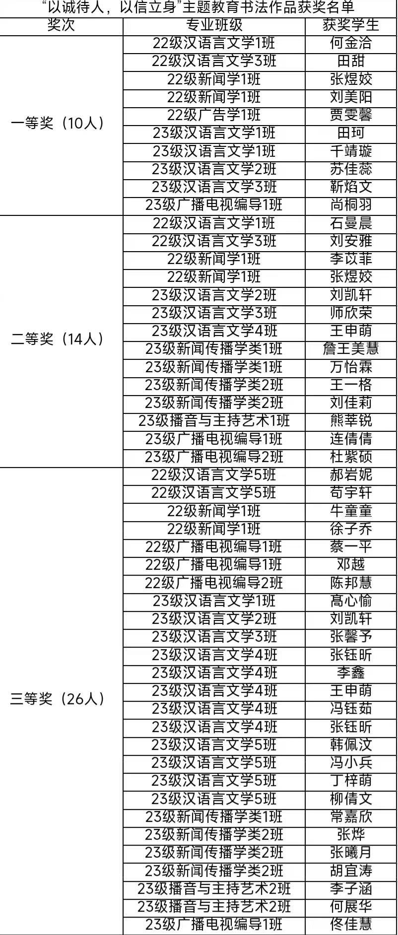 经评选,2022级汉语言文学3班田甜等10名同学获得一等奖,2022级新闻学1班李苡菲等14名同学获得二等奖,2023级汉语言文学1班高心愉等26名同学获得三等奖。