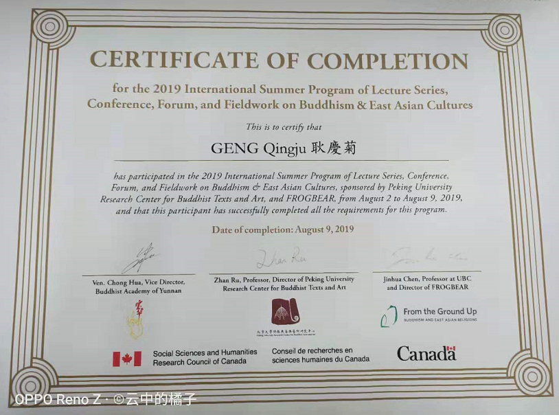 2019年8月2日-8月9日,由个人提交论文网上申报,主办单位严格遴选、学院指派,我院古代文学专业2017级研究生耿庆菊参加了由加拿大英属哥伦比亚大学与北京大学佛教典籍与艺术研究中心举办的2019年度国际佛教与东亚文化暑期研修班。来自海内外各大名校的博士、硕士研究生、青年教师100余人参加了此次活动。
