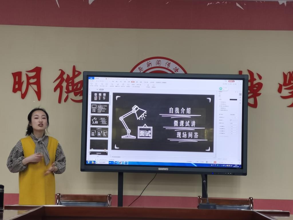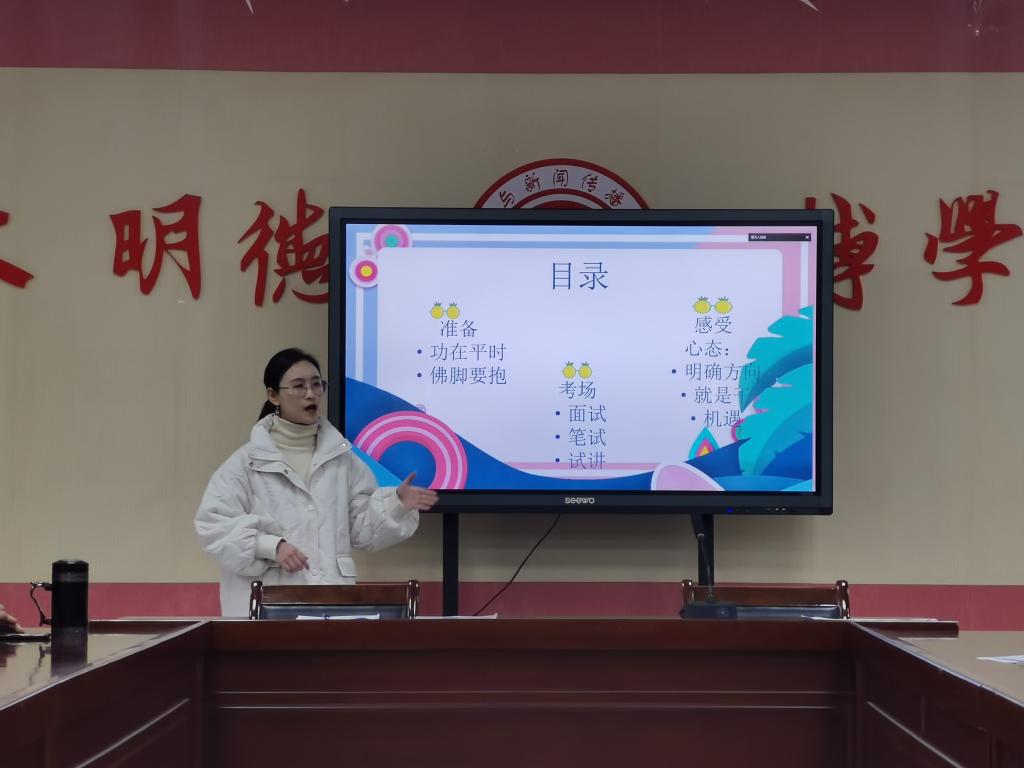 2019级专硕李梦、殷晓、王丽静、母丹、朱虹陪、高杰杰、曹海燕、韩宣、杜楚玉等10名同学分别围绕择业、应聘、学习、实习心得等方面做了经验分享。其中李梦和殷晓选择了自主实习,已经分别和天津南开区、温州市中学签约。她们专门为会议制作了精美的PPT,用现场网络连线的方式,给2020级讲述了自己辗转找工作、参加学校招考的酸甜苦辣。赵蜀欣已经和绵阳市某高中签约,她制作了精美有效的个人简介,告诉学妹们要准确定位自己,要有一定的社会适应能力,不要怕名校学生,要敢于挑战,扬长避短;母丹和朱虹陪已经考取了成都市核心区学校编制教师,她们告诉2020级,找工作要胆大心细,注意展示个人才艺。韩宣在长岭中学实习,她给2020级分享了自己代班主任的体会,告诉学妹们,官办学校也面临一系列改革和发展问题。王丽静、高杰杰、杜楚玉、曹海燕等也将自己在实习过程中的感受和心得,以及在招聘会上找工作过程中积累的经验倾囊相授。