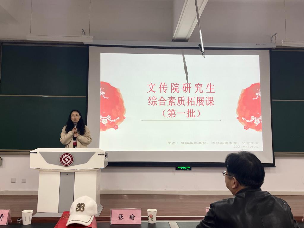 2021年11月9日晚,为提高全体研究生的综合素质水平,我院在博文楼副105教室举办了“文传院研究生综合素质拓展课”(第一批)活动。此次活动由文传院研究生党支部、团支部、研究生会主办,研究生会主席胡静思同学主持,文传院全体在校研究生共同参与。我院邀请了张瑜老师、周小东同学、田兰青同学和冯科同学等四位老师、同学做本次综合素质拓展课的主讲人。文传院副院长孙新峰教授出席了此次活动。