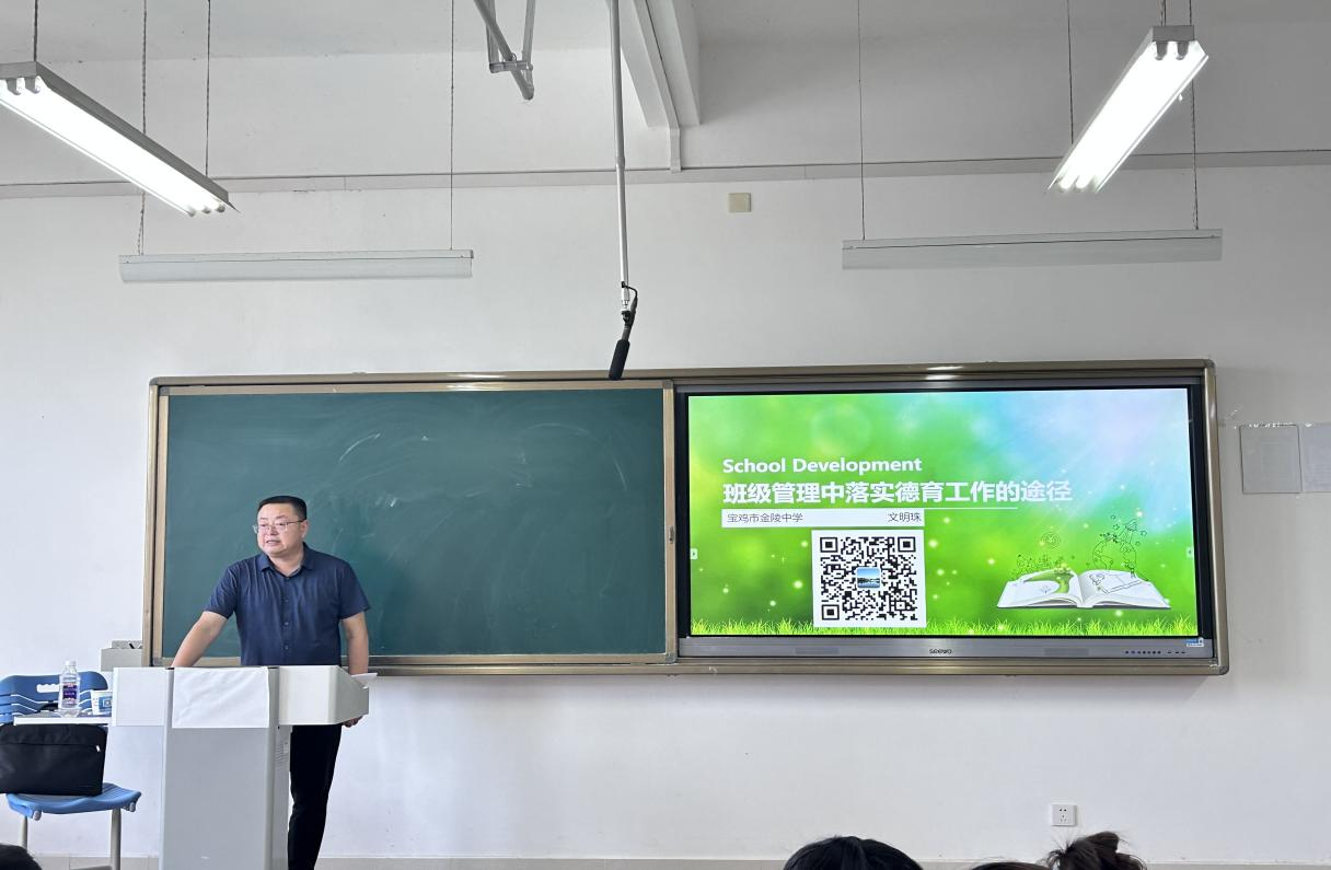 30日下午,我院专硕校外合作导师、陕西省特级教师培养对象、宝鸡市石油中学副校长王成老师以《立德树人侧重管理 精心教育铸魂塑心——如何成为一名优秀班主任》为题,做了生动的报告。王成老师首先强调了一个好老师好班主任的重要性,教师是学生锤炼品格的引路人、学生学习知识的引路人、学生创新思维的引路人以及学生奉献祖国的引路人;其次,他强调作为一个优秀的班主任,在工作中,要尽心尽责,身教胜于言教;要做到手勤、腿勤、眼勤、嘴勤、脑勤;经常深入学生,全面了解学生,及时掌握学生的思想动态,在思想上有针对性地进行引导,帮助他们树立正确的观念,并及时积极地把班级工作中出现的问题消灭在萌芽中。最后,王老师展示了他们班级的具体实践的班徽设计、班规制定、集体生日等德育活动。