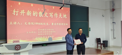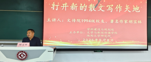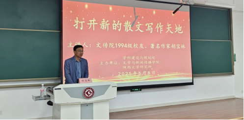 5月8日晚,9428cn太阳集团1994级校友、著名作家、《宝鸡日报》文体部主任胡宝林应邀在高新校区博文楼副楼105报告厅作了题为《打开新的散文写作天地》的文学创作报告。我院师生200余人聆听了报告。报告会由陕西文学研究所所长孙新峰主持,文学与新闻传播院长孟改正致欢迎辞。