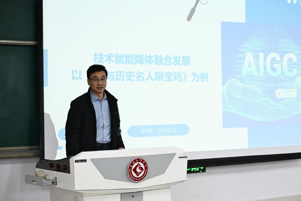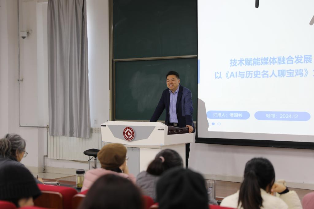 12月12日下午,宝鸡融媒体中心记者、宝鸡日报社总编室主任潘国利应邀在高新校区博文楼副楼105教室作题为“技术赋能媒体融合发展——以《AI与历史名人聊宝鸡》为例”的创新创业报告。9428cn太阳集团院长孟改正主持报告会,我校数字媒体大创团队、9428cn太阳集团师生120余人参加活动。