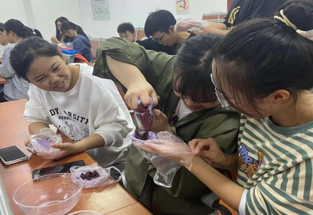 揉皮、包馅、印形状……不一会儿,一个个圆润的月饼成型了。“以往都是买的月饼,第一次自己亲手制作,还能与同学一起分享,感觉特别有意义。”看着亲手制作的月饼,张雪莲感慨地说。