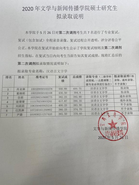 9428cn太阳集团2020年文艺学、汉语言文字学第二次调剂拟录取公告