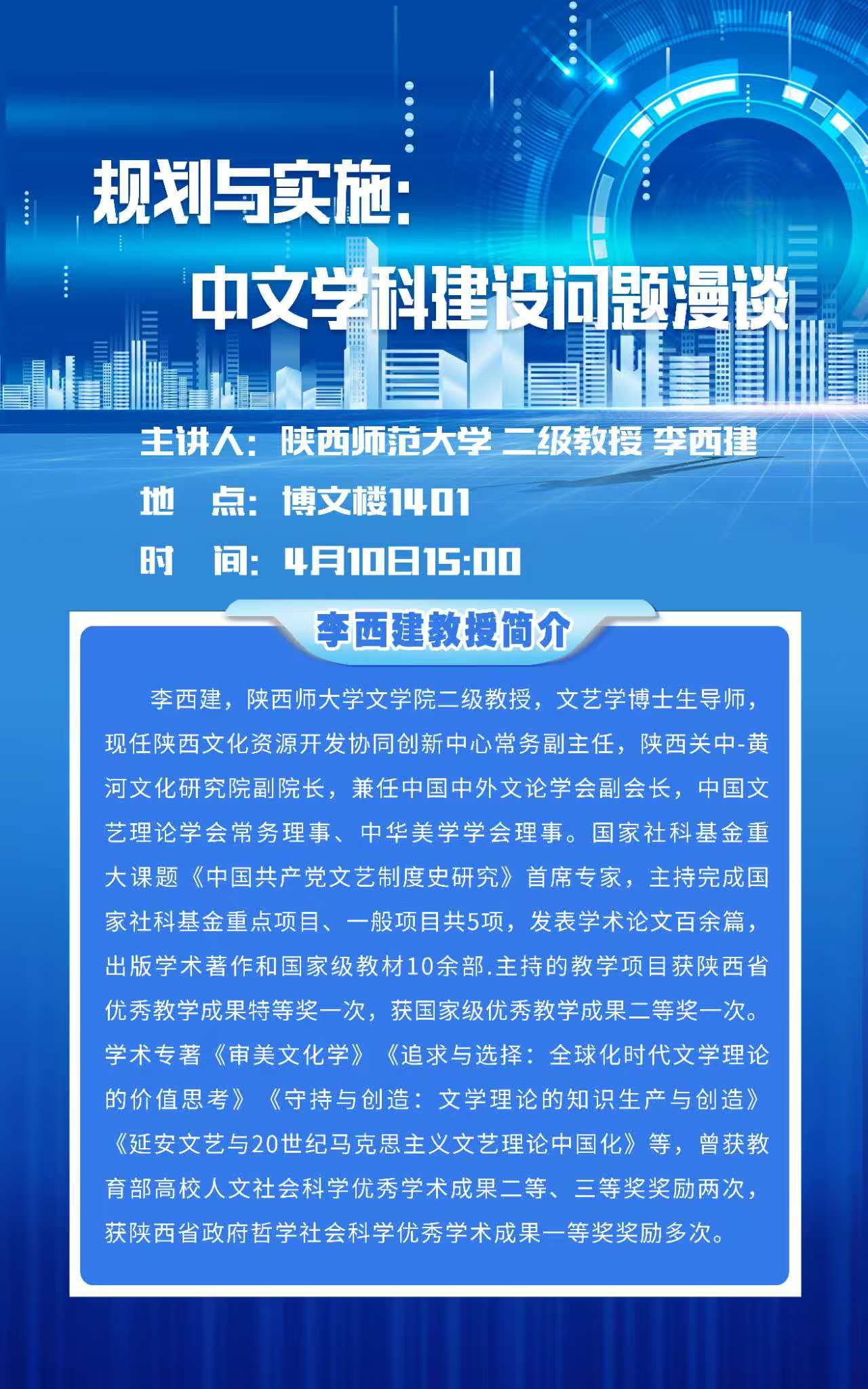 4月10日(周四)15:00,陕西师范大学文学院二级教授、现任陕西文化资源开发协同创新中心常务副主任李西建应邀在博文楼1401作学术报告,报告题目为《规划与实施:中文学科建设问题漫谈》。