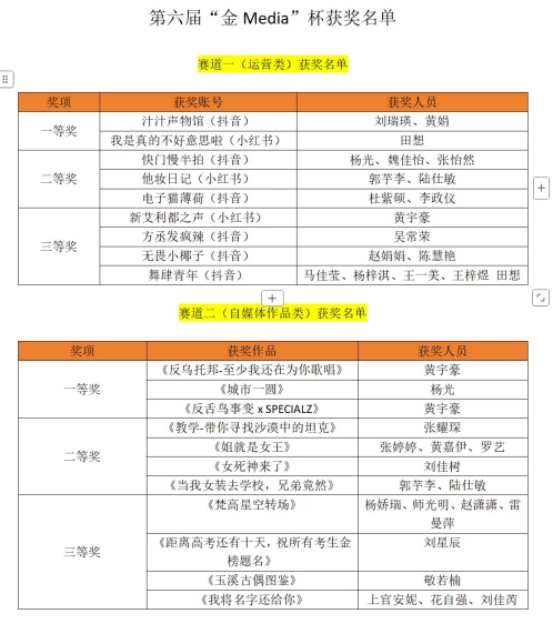 本届“金Media杯”新媒体创意大赛紧扣新媒体行业发展趋势,以实战为导向,鼓励学生探索多元表达形式。赛道一“新媒体账号运营”聚焦账号定位、内容策划与用户互动,20组参赛团队通过数据化运营与创意呈现展开角逐,最终9组账号分获“最佳运营类”一、二、三等奖。赛道二“新媒体作品创作”则侧重短视频、H5、图文等单件作品的内容创新,18组投稿作品涵盖社会热点、文化传承、校园生活等主题。最终10组作品分获“优秀作品类”一、二、三等奖。