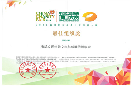 我院在深化专业实践教学基础上,精心指导学生创作,积极组织参赛,广播电视编导专业的15部微电影作品获得入围。经过网络投票和专家评选,微电影《归》荣获优秀作品奖。我院与江西师范大学传播学院、四川师范大学新闻与传播学院等三所院校共同荣获“最佳组织奖”。