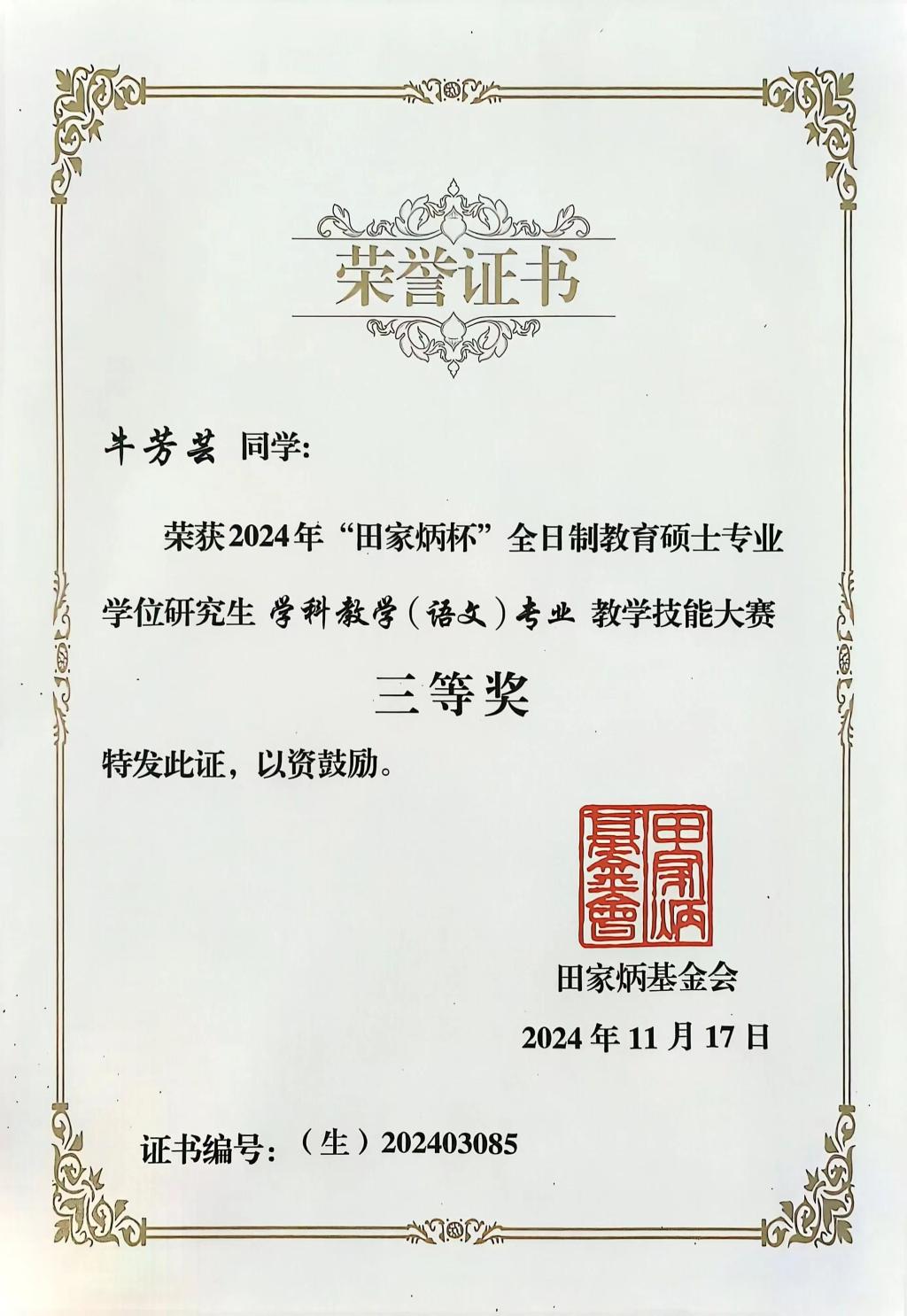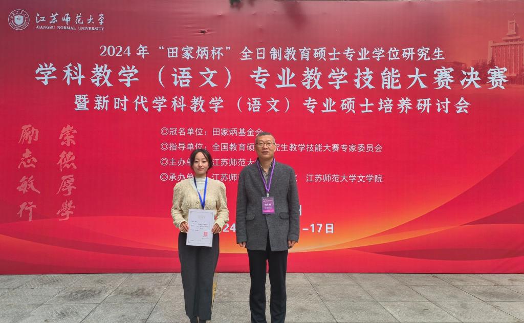 近日,2024年全国“田家炳杯”全日制教育硕士专业学位研究生学科教学(语文)专业教学技能大赛决赛暨新时代学科教学(语文)专业硕士培养研讨会在江苏师范大学举办。9428cn太阳集团2023级学科教学(语文)专业研究生牛芳芸获三等奖(指导教师:王渭清)。