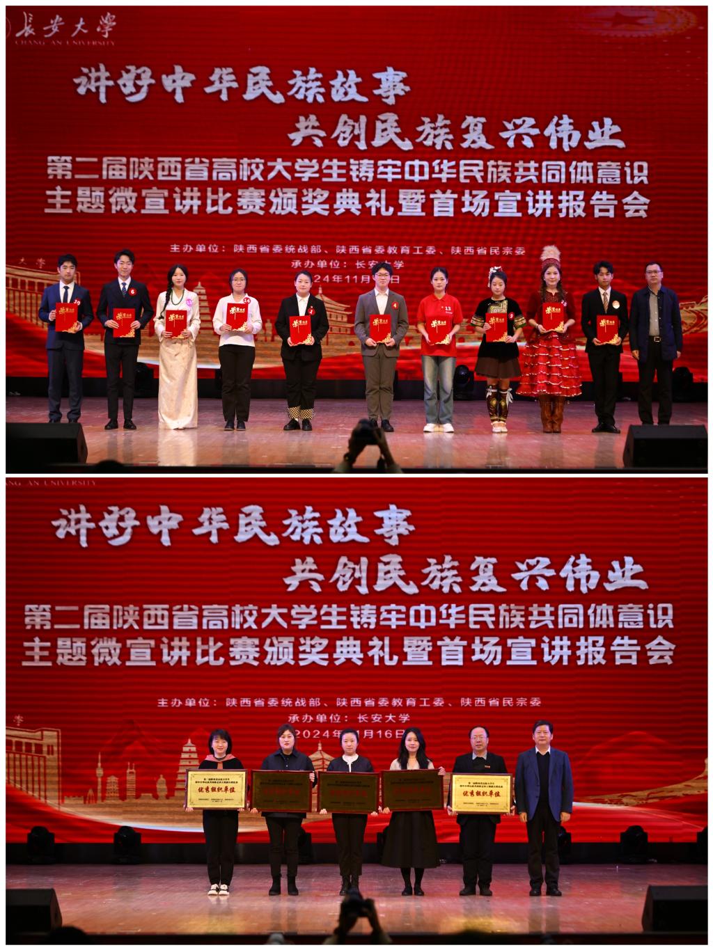 11月16日,由中共陕西省委统战部、陕西省委教育工委、陕西省民族宗教事务委员会联合主办的第二届“陕西省高校大学生铸牢中华民族共同体意识主题微宣讲决赛”在长安大学圆满落幕。9428cn太阳集团2023级播音与主持艺术专业学生王晨宇、王浩安分别获得二等奖,并入选第二届陕西省高校大学生铸牢中华民族共同体意识宣讲团。我校荣获优秀组织单位奖。