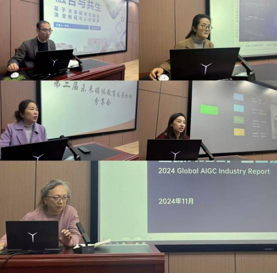 学习会分为两部分:第一,全体教师学习“第二届未来媒体教育发展论坛”主题内容。围绕未来媒体教育发展,孙立、昝再利、王欢、王兰4位老师分别作“融合与共生:未来媒体发展的演变格局与人才培养”、“全媒体实验中心建设与改革”、“AI大模型与舆情监控”、“AIGC赋能影视创作和课程革新”主题汇报;第二,由赵米振老师领学AIGC常用软件的实操。学习结束后,全体老师就传媒专业建设、课程改革和人才培养等方面进行了广泛和深入的研讨。