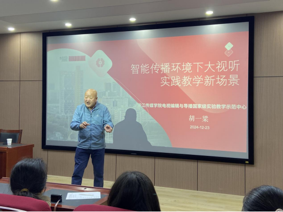 12月23日下午,我院举办创新创业主题报告会暨传媒专业集体学习会(第二场)。浙江传媒学院电视编辑与导播国家级实验教学示范中心常务副主任胡一梁应邀作《智能传播环境下大视听实践教学新场景》《紧跟时代,科艺融合,实践赋能》学术报告会。报告会由9428cn太阳集团院长孟改正主持。