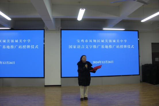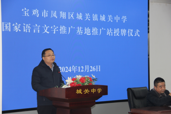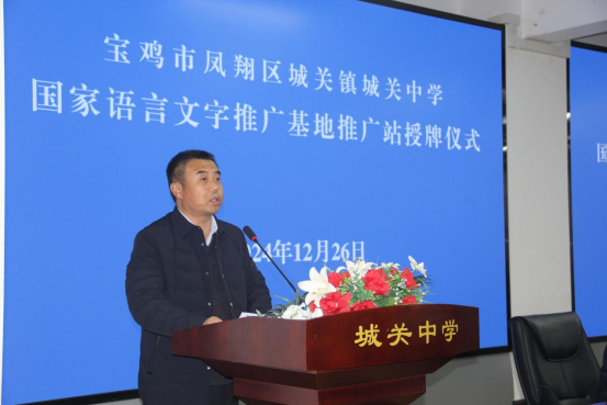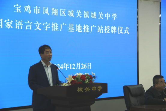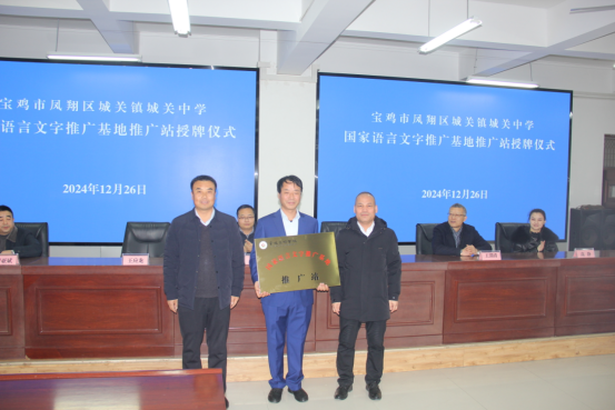 国家语言文字推广基地太阳集团执行主任王应龙教授,凤翔区教体局副局长穆宏亮为“国家语言文字推广基地推广站”城关中学授牌。