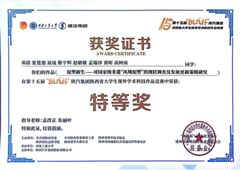 2025年5月,我院项目“泥塑新生——对国家级非遗凤翔泥塑现状调查及发展更新策略研究”荣获第十五届“挑战杯”陕汽集团陕西省大学生课外学术作品竞赛省级特等奖。