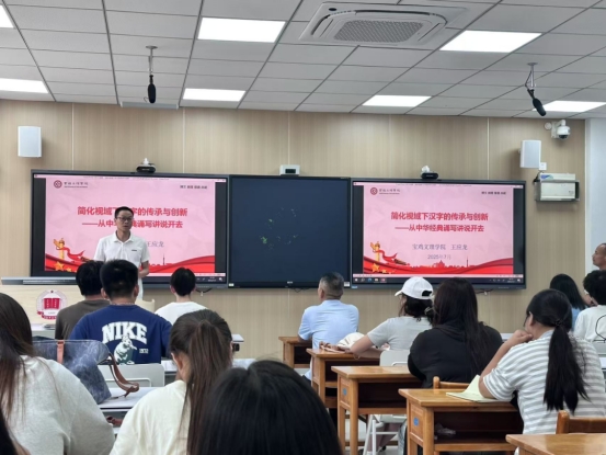 讲座伊始,王应龙教授从中华经典诵写讲大赛入手,强调了经典是文化传承的有效形式,重在传诵中国古代优秀文化、革命文化和社会主义先进文化,引领社会价值观。随后聚焦汉字的传承与创新,结合汉字简化的方法和过程,强调汉字的传承与创新呈现出辩证统一的关系。最后着眼当下,聚焦数智时代汉字简化的审视,提出了汉字简化坚持规范化和创新化并重,在系统化改造基础上不断优化汉字体系。