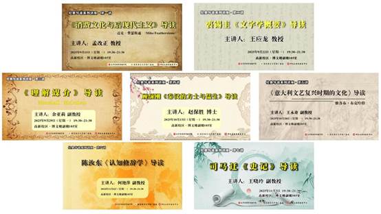本学期我院举办了七场“经典导读”系列专题讲座。此次系列讲座分别由孟改正教授导读迈克·费瑟斯通的《消费文化与后现代主义》、王应龙教授导读裘锡圭《文字学概要》、余亚莉副教授导读马歇尔·麦克卢汉的《理解媒介》、赵保胜博士导读顾颉刚的《秦汉的方士与儒生》、王永奇副教授导读雅各布·布克哈特《意大利文艺复兴时期的文化》、何艳萍副教授导读张颂《朗读者》、王晓玲副教授导读司马迁《史记》。