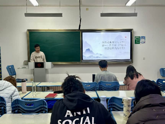分享环节中,四位同学各展学术所长,带来兼具深度与新意的读书心得。崔天姿同学以孟悦、戴锦华《浮出历史地表—— 现代妇女文学研究》一书为核心,借助西方女性主义理论与符号学视角,聚焦丁玲、张爱玲等作家,探讨女性创作如何突破历史遮蔽、重构话语空间。孔茜同学围绕夏志清《中国现代小说史》,通过剖析鲁迅、巴金、钱钟书等作家作品,从社会、人性、存在三重维度,深入阐释现代小说蕴含的“道德视景”与悲剧意识。段志鹏同学以陈平原《中国小说叙述模式的转变》为切入点,从形式研究的意义、方法及学术启示展开分享,提出的开放性问题极具启发性。杜文静同学以“流派为脉,方法为魂”为题,解读严家炎《中国现代小说流派史》的理论突破,凭借扎实的史料考辨与清晰的研究脉络,展现了历史主义视角与多元批评方法的融合运用。