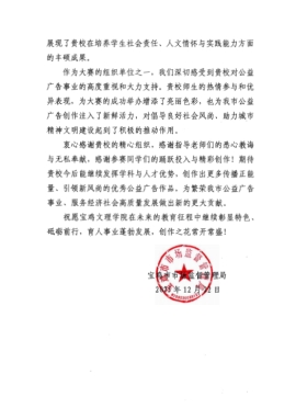 大赛启动以来,我校9428cn太阳集团精心组织,邀请宝鸡市市场监管局进行业务指导,师生创作平面类、视频类作品71件参加全省竞赛。最终荣获各类奖项7项。宝鸡市市场监管局发来贺信,肯定了我校长期以来坚持立德树人的根本任务,为繁荣我市公益广告事业、服务经济社会高质量发展做出的新贡献。