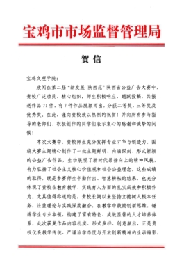 近日,第二届陕西省“新发展 陕西范”公益广告大赛结果揭晓,我校师生获二等奖1项、三等奖3项、优秀奖3项。宝鸡市市场监管局发来贺信。